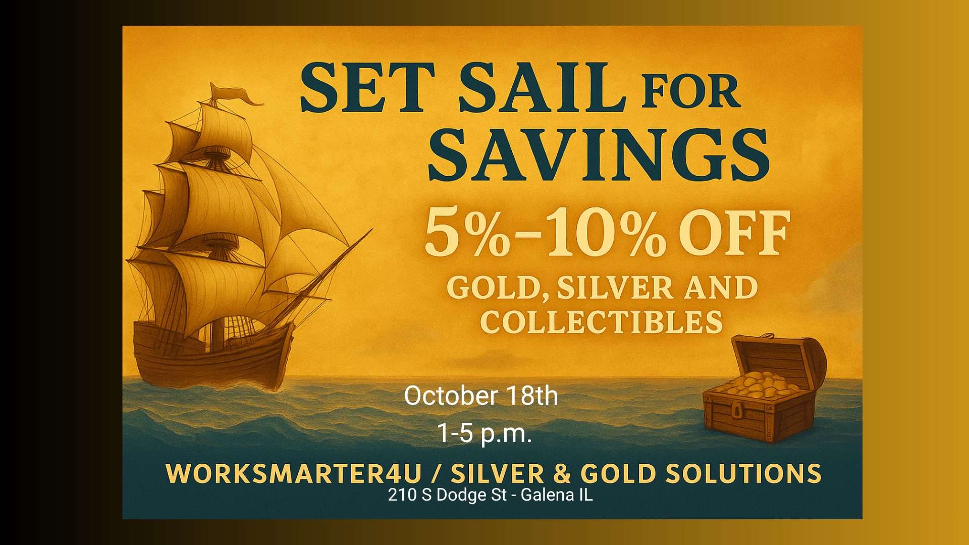 This Saturday, October 18th from 1–5 p.m., join Silver & Gold Solutions / Worksmarter4u for our special “Set Sail for Savings” Event in Galena Illinois — a one-day opportunity to discover and save on real-world treasure!